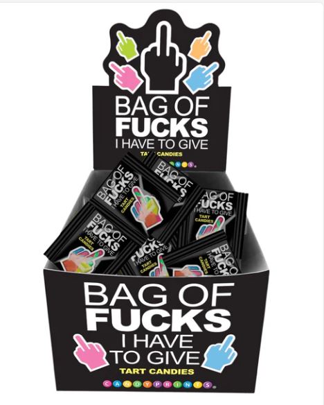 Introducing the Bag of Fucks I Have to Give candy because sometimes you just need a little humor to sweeten your day! Get this POP display with 100 mini-packs marked for individual sale; these fruit-flavored middle fingers are here to make a statement. Perfect for when you want to express how much you carewithout saying a word. Whether treating yourself or gifting it to a friend who could use a laugh, this candy will surely be a conversation starter. Grab your Bag of Fucks I Have to Give today and savor the taste of not giving a damn!Ingredients