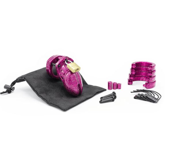 New for 2025! The stars have aligned to create our most captivating cock cage yet! The CB-X Guarded Galaxy glitter chastity kit collection features the worldwide best-selling CB-6000S male chastity device and comes complete with every required component to lock a cock!Step into a Guarded Galaxy prismatic penis prison and choose from three stellar sparkly finishes: Glam Rock Blue, Pink Twinkle, or Ultraviolet.Made from high-quality and body-safe ABS plastic, the CB-6000S cock cage kit is a premium, all-inclusive modular chastity cage system for beginners or well-seasoned chastity wearers. The CB-6000S male chastity kit includes five U-ring sizes, multiple locking pins, and corresponding spacers to help achieve a custom-tailored fit.The CB-6000S is a 2″ chastity cage designed for comfortable long-term and short-term wear. CB-X chastity kits and cages are 100% authentic, durable, and made to prioritize user safety.Product features:2 inch cage length (“Cage length” is the length of the cage itself)1 inch inner diameterStunning glitter finishAvailable in pink, purple, and blue glitterDurable and lightweightComfortable and customizable fitFunctional opening for urinationVentilated cock cage design for hygiene and breathabilityMaterial:Body-safe, medical-grade ABS plastic (glitter is mixed with the ABS)