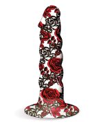 (D) Collage Iron Rose Dildo from Icon Brands. Premium silicone adult toys, with beautiful, body safe coloring. Each piece is hand crafted for your unique pleasure. Eye popping designs tattooed right onto the silicone. Soft and silky and just the right size, they are colorful, whimsical, elegant and stunning. Each features and ultra grip suction cup which also makes them harness compatible. They quickly warm to your touch, are non-porous and easy to clean. Water based lubricant. Gentle Soap and water to clean only, never an alcohol based soap. Size 7 inches in total length by 3.7 inches in width. Categories: Dildos, Dongs, Unnatural Dildos and Dongs, G-Spot Stimulator. No longer available. 2024.