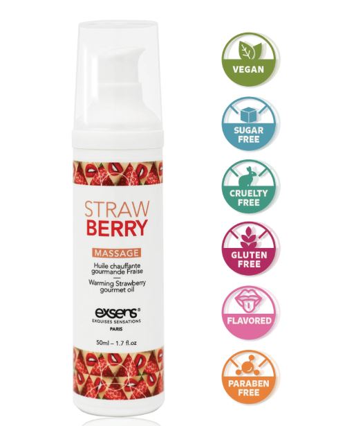 EXPERIENCE FULL BODY PLEASURE with Exsens Warming Strawberry Intimate Massage Oil. Condom friendly and safe to use on any body part. Explore intimate areas as desired with warming sensations and a delectable flavor that will have you urging for moreNEXT LEVEL INTIMACY that will blow your partner’s mind. This sensationally sweet strawberry gourmet massage oil is meant to enhance foreplay and oral pleasure. This deliciously lickable gel will bring flavor, fun and fantasy to all of your intimate momentsSENSUALLY DELICIOUS with a lickable fruity flavor that will satisfy your taste buds and senses. This sexual enhancing warming gel will make your play even hotter and tastes as good as it feels. Mouth-to-skin contact intensifies the heating effect