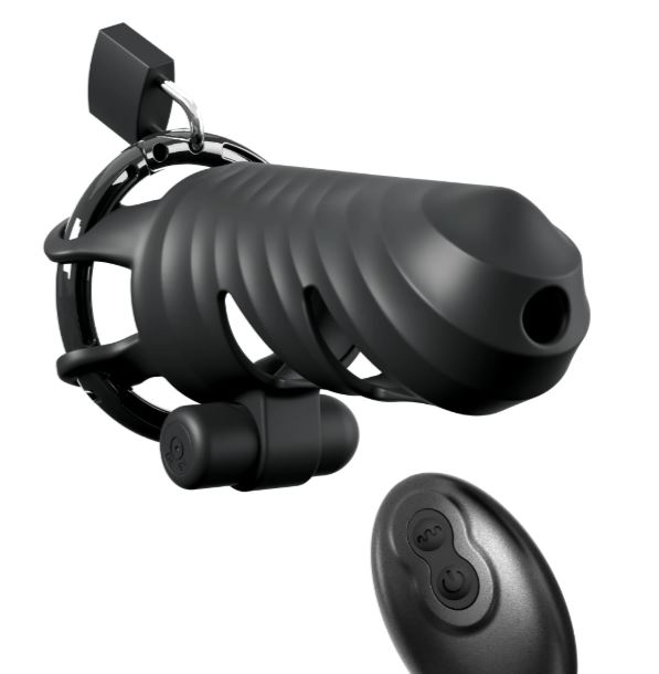 Surrender has never felt so secure with the Remote-Controlled Vibrating Cock Blocker! Fasten the lock, hide the keys and make sure your partner keeps their cock where it belongs! This high-end chastity cage is made from our Elite Silicone and is designed for comfortable long-term wear. The chastity device is lightweight, flexible, and breathable, but once the lock is applied, your subject cant get hard no matter how aroused they are! This is no ordinary cock blocker… It sports a powerful remote-controlled, rechargeable 10-function vibrator that can be used as the ultimate tease for your partner! Providing custom comfort and total captivity, the Vibrating Cock Blocker features an adjustable ring that wraps around your subjects entire package, leaving them locked inside the breathable silicone sleeve. With unparalleled comfort, this ventilated silicone chastity cage is the ultimate chastity device for first-timers and serious fetish enthusiasts alike. Enjoy the thrill of locking your lover up, or relinquish control and hand over the keys! The silicone cage is easy to wash and super-hygienic. The vent holes allow you to clean your subjects package while they still wear the cage, and the ring is made from high-density plastic. The silicone sleeve has a small pee-hole to assist with urination, and the entire device can be worn under clothing for amazing one-of-a-kind thrills!