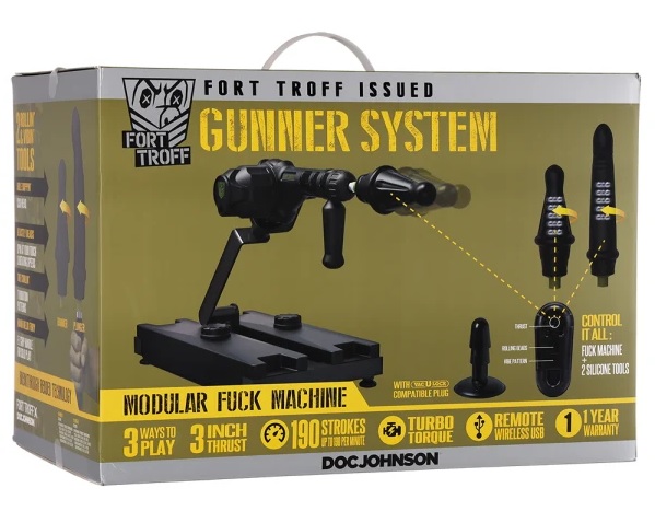 Fort Troff’s Gunner System is an impeccably designed 3-in-1 modular Fuck Machine for everybody, from beginners to extremely advanced players. Two vibrating and rotating heads can be can be used mounted to the full machine base, with the handheld turbo torque gun, or solo with the included handle. The base is adjustable to fuck you in any position you want. Once it’s filled with water, sand, or the heavy material of your choosing, it’ll stay steady on your bed or favorite playplace.The included remote control does it all; it controls the torque’s thrusting speeds as well as the Tools’ rotating beads and vibrating functions. Plus, the remote is magnetic and can attach to the Gunner’s base so it never goes AWOL. With the included Vac-U-Lock adapter, there are hundreds of ways to play.