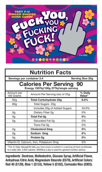 Introducing the “Fuck You, You Fucking Fuck!” Candy the sweet treat that says what everyone else is thinking! This display of 100 mini-packs, each filled with 5 sassy middle finger candies, is your new best friend for any occasion that needs a little extra attitude. Increase your impulse sales at the counter, use as party favors or as a cheeky surprise for those special people in your life who just need a friendly reminder of how you really feel. With a taste that’s as bold as its message, these candies will leave everyone laughing and craving more. Get ready to add a sprinkle of sass to your day grab your bag today and let the fun begin!