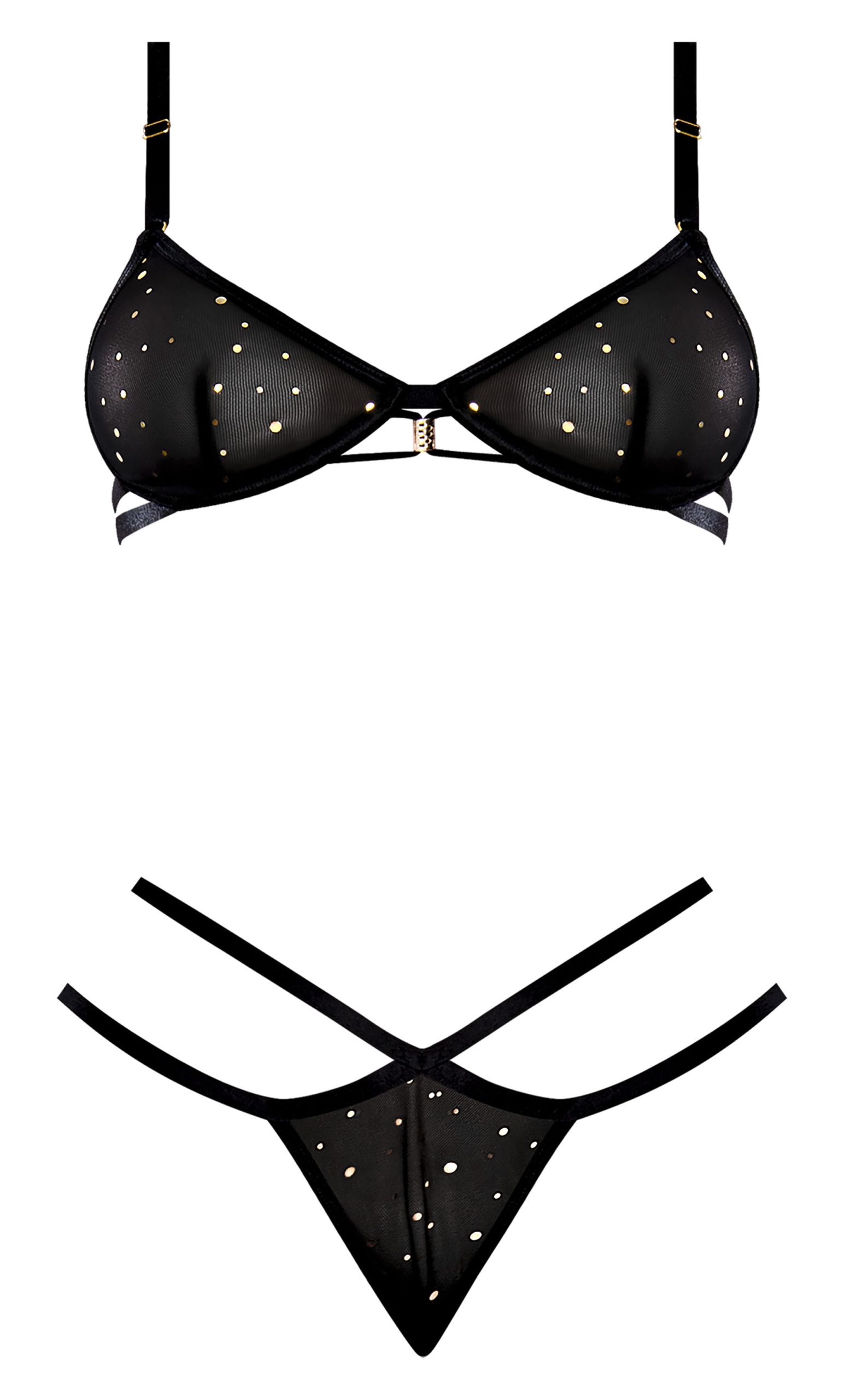 Glitz and Glam Bra and Thong Set Black S/M from Magic Silk Lingerie. From the Exposed by Magic Silk Collection, this style includes: A black mesh bra featuring dotted gold sequins, cage style back straps with hook and eye closures, thick elastic ajustable shoulder straps with gold tone sliders, and a black mesh thong with matching gold sequins and cross style hip straps. Indulgent gold glittering sequins adorn a sheer black mesh fabric, fitted to the body. Intricate strapping is stretchy and decorated with decadent gold beads. Fabric contents: 90% Polyester, 10% Spandex. Care: hand wash cold water. No Bleach. Dry flat. Ladies sizes 4 to 10. Categories: Lingerie, Clothing, Bra Set, Xmas items, Women’s Underwear, Naughty Role Play. 2023.