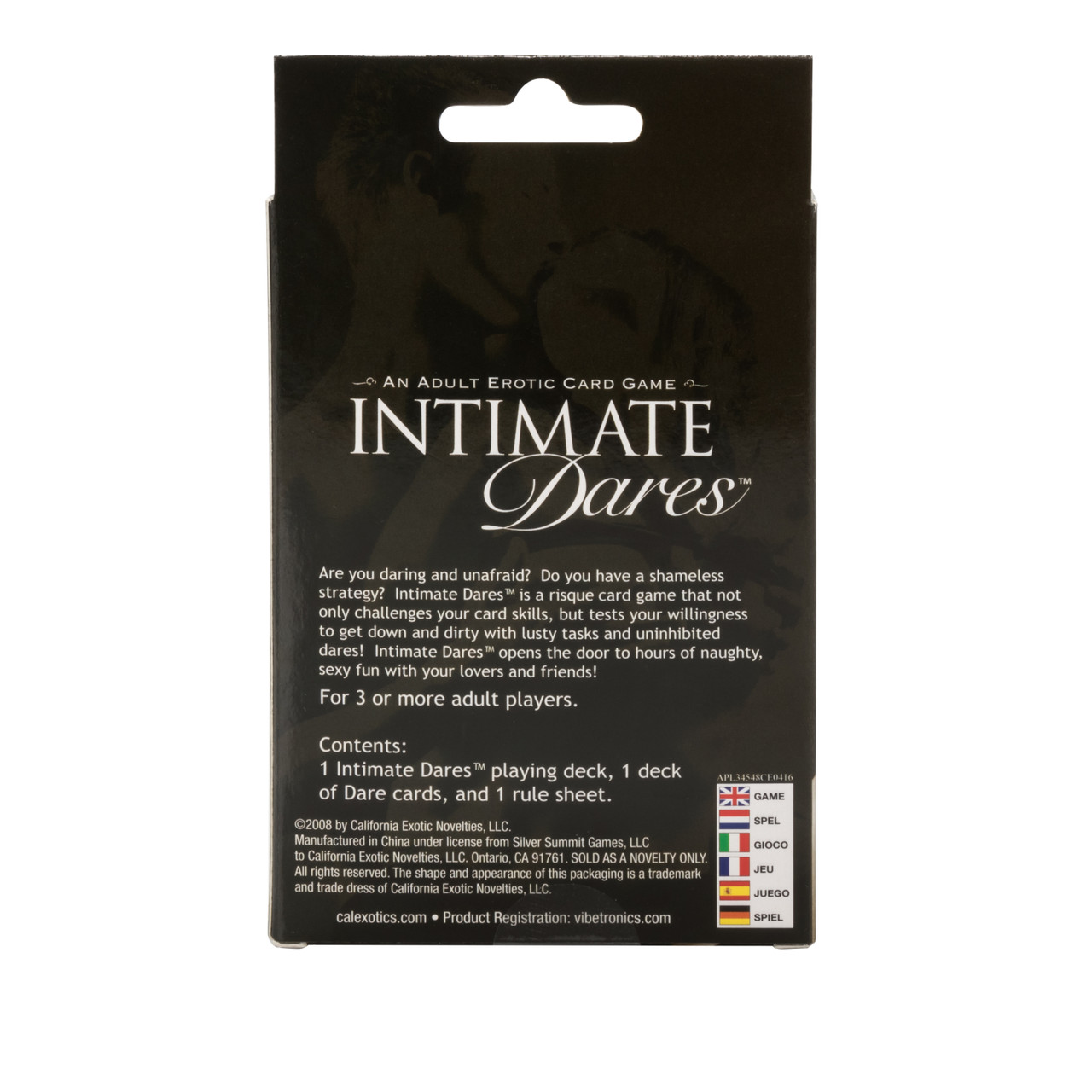 An Adult Erotic Card Game Intimate Dares from California Exotic Novelties is a risque card game that not only challenges your card skills, but tests your willingness to get down and dirty with lusty tasks and uninhibited dares! Test your card skills and sense of erotic adventure with the Intimate Dares Game. The daring adult couples card game tests your willingness to get down and dirty, and to let go of your inhibitions. The exciting and thrilling game is great entertainment for a night in together. Play to win, by challenging each other to reveal sensuous secrets and to take on lusty tasks. The erotically playful game comprises of 1 Intimate Dares playing deck, 1 deck of Dare cards and a rules and instructions sheet. The enticing, easy to play game is suitable for 3 or more adult players and involves accepting a series of raunchy tasks and uninhibited dares. Enjoy unlimited raunchy fun and sensuous delight. The risque game is ideal entertainment for a fun night in. The addictive card game tests your Intimate Dares strategy and challenges lovers to open the door to sensual exploration. Play the erotic, fast paced card game with your lover and friends, and find out all there is to know about their naughty secrets. The handy 6.25 inches by 3.75 inches by .75 inch size playing cards are perfect for game play fun wherever you go. An erotic adult card game. Opens the door to hours of naughty, sexy fun with your friends and lovers! For 3 or more adult players. For 2 or more adult couples. Includes: 1 Intimate Dares Playing Deck, 1 Deck of Dare cards, rule sheet and full instructions. 6.25 inches height by 3.75 inches length by .75 inch depth. Bulk weight: 6.3 ounces. Contents of the game may vary. Specifications: SKU SE-2529-00-3. Color: Multi-Colored. 1 Year Warranty. Measurements: 6.25 inches by 3.75 inches by .75 inch. Bulk weight 6.3 ounces. Package: 8 ounces. Package: 0.75 inch by 3.75 inches by 6.25 inches. More Fun, Gag Gifts, Party Favors, Kits and Games for Couples, Games. Categories: X-Rated Adult Games, Valentine’s Day, Sex Toys for Couples, Adult Party Games. Intimate Dares Game is a registered trademark for California Exotic Novelties. Sex toys and sexual wellness. 2023.