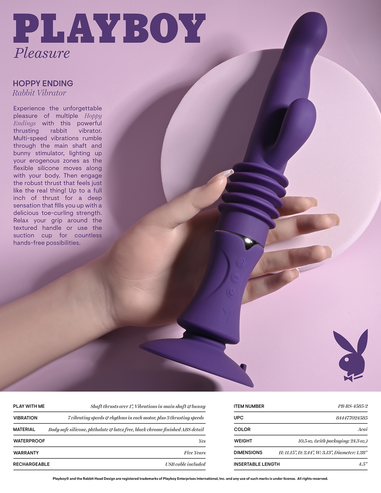 Playboy Pleasure Hoppy Ending Purple Rabbit Vibrator from Evolved Novelties. Experience the unforgettable pleasure of multiple Hoppy Endings with this powerful thrusting rabbit vibrator. Multi-speed vibrations rumble through the main shaft and bunny stimulator, lighting up your erogenous zones as the flexible silicone moves along with your body. Then engage the robust thrust that feels just like the real thing! Up to a full inch of thrust for a deep sensation that fills you up with a delicious toe curling strength. Relax your grip around the textured handle or use the suction cup for countless hands free possibilities. Panel details: Play with me key feature: entire toy thrusts up to over 1 inch, vibrations in main shaft and bunny. Vibration: 7 vibrating speeds and rhythms in each motor, plus 3 thrusting speeds. Material: body safe Silicone, phthalate and latex free, black chrome finished ABS Plastic detail. Waterproof vibrations. 5 years warranty. Rechargeable: USB cable included. Size specifications: Height 11.15 inches, Depth 2.44 inches, Width 3.13 inches. Insertable length 4.5 inches, diameter 1.28 inches. Categories: Vibrators, Rabbit Style Vibrators, Eco-Friendly Sex Toys, Rechargeable Vibrators, Sex Toys for Women, G-Spot Rabbit Style Vibrators. 2024.