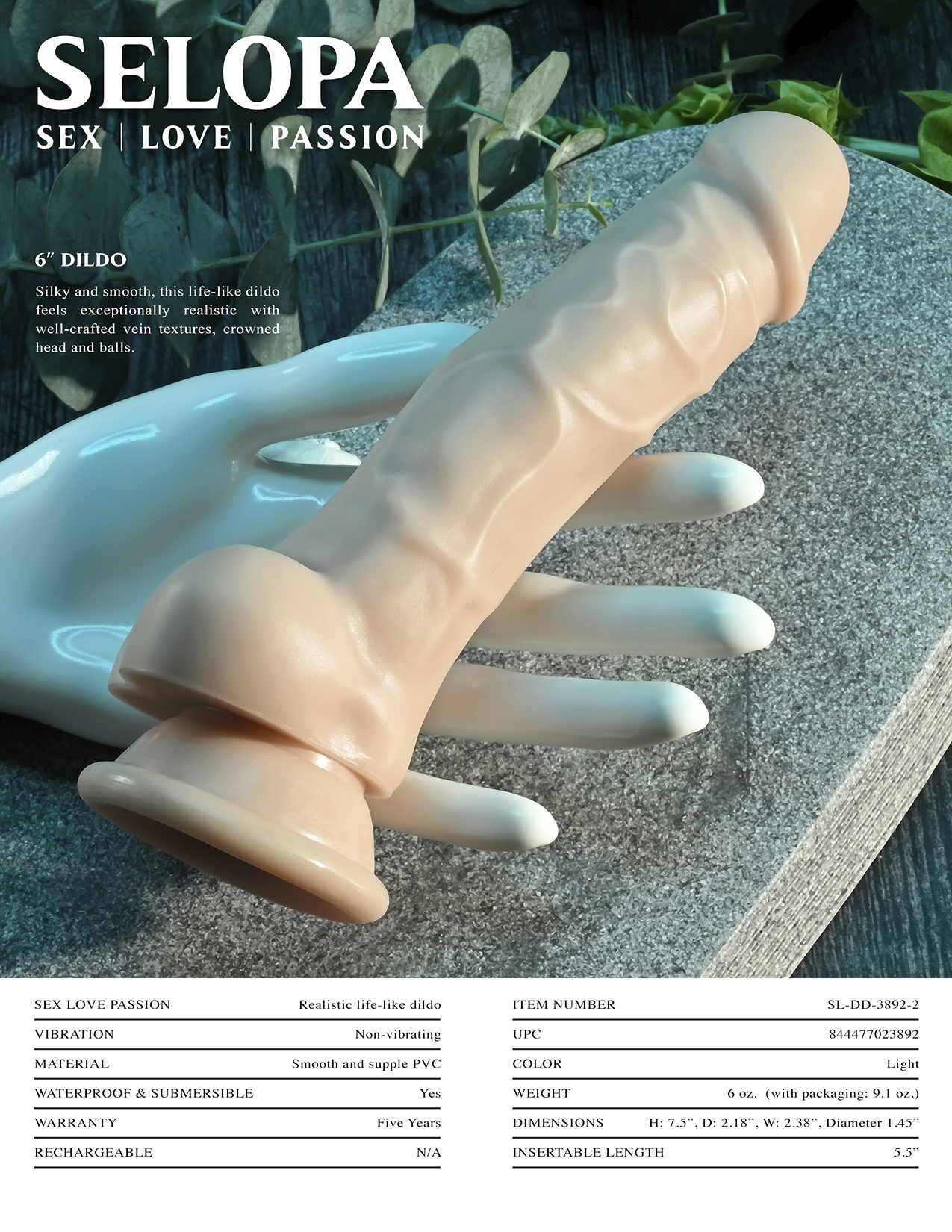 Selopa 6 inches Dildo Light Skin Beige from Evolved Novelties. Sex, love, passion. Silky and smooth, this life like dildo feels exceptionally realistic with well crafted vein textures, crowned head and balls. Features: flexible, life like dildo with suction cup base. Made from smooth and supple PVC. Waterproof, non-vibrating realistic dildo and it is submersible. Phthalate free and latex free. Size Length 7.5 inches, Depth 2.18 inches, Width 2.38 inches. Insertable length 5.5 inches, insertable diameter 1.45 inches. 5 years warranty. Categories: Dildos, Dongs, Realistic Small and Medium Dildos, Dildos and Dongs Realistic. 2024.