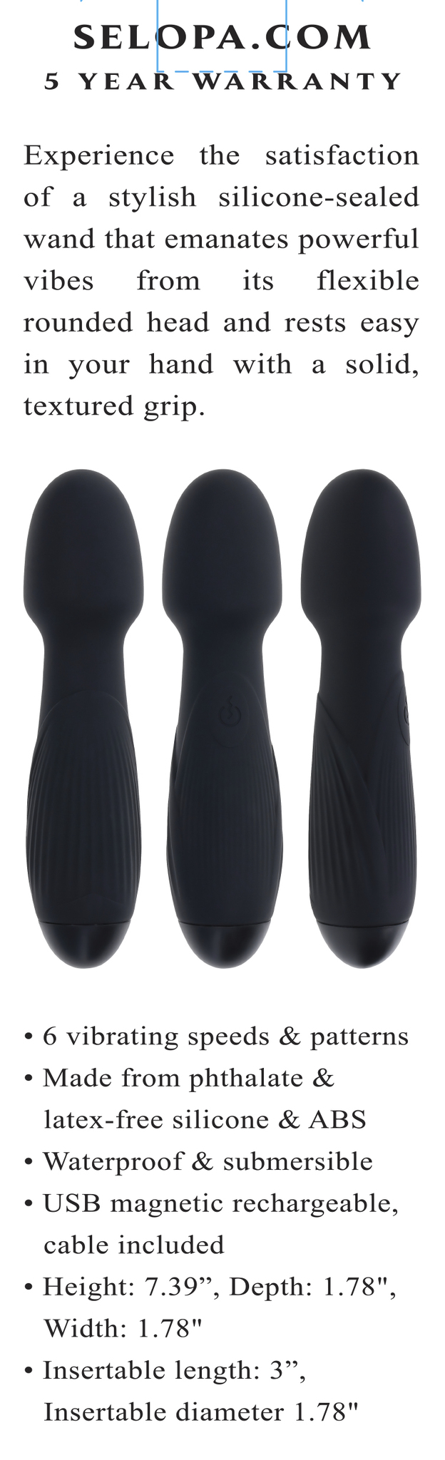 Selopa Power Trip from Evolved Novelties. Power Trip SELOPA SKU: SL-RS-4165-2. UPC: 844477024165. Experience the satisfaction of a stylish Silicone sealed wand that emanates powerful vibes from its flexible rounded head and rests easy in your hand with a solid, textured grip. Specifications: 6 vibrating speeds and patterns. Made from body safe phthalate free and latex free Silicone and ABS Plastic. Waterproof and submersible. USB Magnetic Rechargeable, cable included. Size Height 7.39 inches, Depth 1.78 inches, Width 1.78 inches. Insertable length 3 inches. Insertable diameter 1.78 inches. Categories: Vibrators, Eco-Friendly Sex Toys, Rechargeable Vibrators, Palm Size Massagers, Sex Toys for Women. 2024.