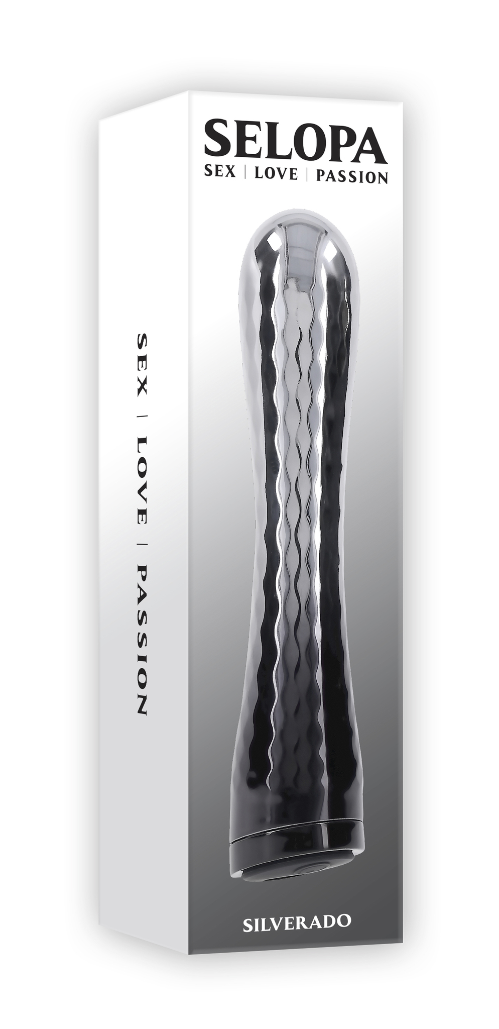 Selopa Silverado Vibrator from Evolved Novelties. Silverado Selopa SKU: SL-RS-4189-2. UPC: 844477024189. Description: stylish and textured for an easy grip, this chic chrome shape delivers powerful vibrations in a long, slender shaft that finishes with a smooth, bulbous tip. Specifications: 3 speeds and 7 patterns. Made from body safe materials phthalate free and latex free ABS Plastic, Silicone button. Waterproof and submersible. USB Magnetic Rechargeable, cable included. Size height 7 inches, depth 1.55 inches, width 1.55 inches. Categories: Vibrators, Classic Vibrators, Eco-Friendly Sex Toys, Rechargeable Vibrators, Sex Toys for Women. 2024.