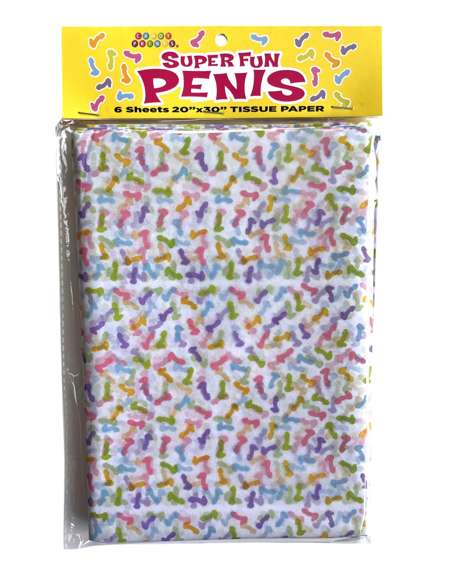 Wrap up your giggles and gifts with the Super Fun Penis Tissue Paper! Perfectly designed to bring a smile to any bachelorette party, this tissue paper adds a cheeky twist to your presents. Whether youre wrapping a saucy surprise or want to add some humor to your gift-giving, these six sheets of hilarity will do the trick. Why settle for plain tissue paper when you can go bold and bawdy? Grab a pack today and watch as your gift becomes the life of the party!