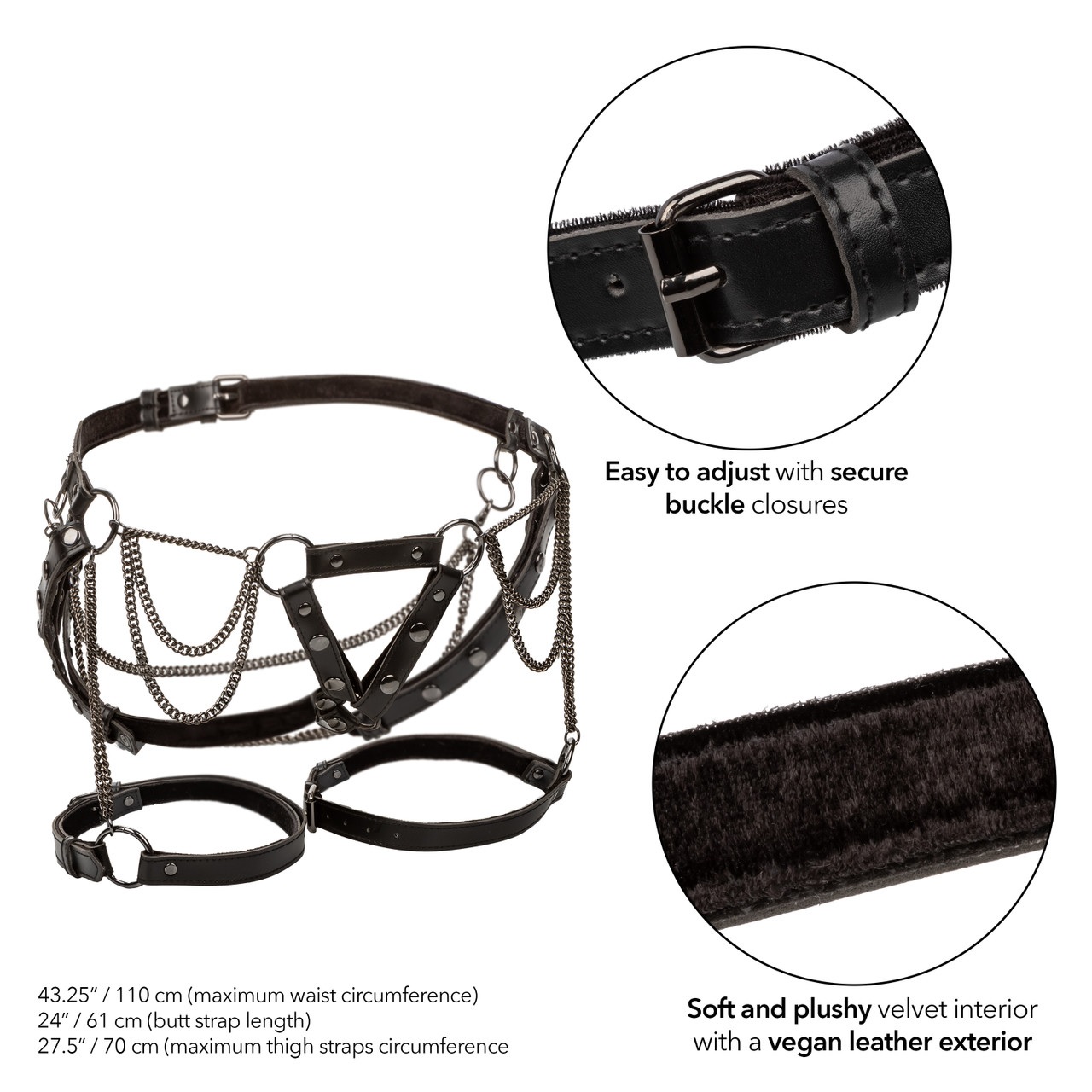 Step into the realm of bold sensuality with the Euphoria Collection Thigh Harness With Chains From CALEXOTICS, a piece that effortlessly embodies the fusion of daring style and luxurious comfort. This premium thigh harness, adorned with heavy-duty metal chains, is a statement piece for those who revel in the art of seduction and power. Designed for those who dare to express their deepest desires, it’s a perfect blend of contemporary design and functional allure.Crafted for adaptability, the harness features easily adjustable waist and thigh straps, equipped with secure buckle closures. These thoughtful details ensure a snug, comfortable fit for most standard sizes, allowing you to move freely and confidently. The cascading chains add not only a visual impact but also a tantalizing weight and texture, enhancing the sensory experience with every movement.The inner material of this harness is as inviting as its exterior is bold. Lined with soft, plushy velvet, it offers a gentle caress against your skin, contrasting beautifully with the vegan leather exterior. This combination of materials speaks to a commitment to ethical luxury and sustainable style, all while ensuring maximum comfort during wear.Meticulously constructed with double padding and double stitching, the Euphoria Collection Thigh Harness With Chains is built for durability and longevity. Adorned with nickel-free metal accents, it is inclusive for all skin types. This harness isn’t just an accessory; it’s a gateway to exploring your own power and sensuality, a tool for expression that fits seamlessly into your deepest desires.