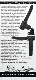 Evolved Too Hot To Handle Powerful Machine is sophisticated design meets ultimate satisfaction with this powerful machine that makes your pleasure its top priority! An adjustable suction cup mount gives you hands free play like you have never experienced! Click the sleek Silicone shaft into the main barrel and away you go, thrusting in 7 glorious speeds with over half an inch of delicious push. Then unleash the vibrations for 7 speeds to rock your world, and do not forget the heating function that warms you up from the inside! An elegant 3 button control panel allows access to each separate motor with ease, giving you the ride of a life time! And when it is time to clean up, the shaft packs up into the long handle, everything comes with a neat cap for storage. Rechargeable, splashproof and easy to clean! Features: thrusting, heating, vibrating machine. Detachable vibrating shaft. Vibrating shaft stores in unscrewable handle. 7 thrusting speeds and functions .7 inch thrust. Heating function maximum temperature 35 degrees Celsius C or approxmiately 95 degrees Fahrenheit F. Adjustable suction cup mount. Caps to cover thruster and suction mount. Textured shaft for extra stimulation. Light emitting diode LED lights illuminate buttons when in use. Size adult toy height 9.3 inches, depth 5.2 inches, width 2.2 inches. Attachment size height 6.15 inches, depth 1.35 inches, width 1.38 inches. Bulk weight over 1 pound. Made from body safe phthalate free materials: Silicone vibrator and ABS plastic base. Color Rose Gold finished details. Phthalate and latex free. Magnetic rechargeable, USB cable included. Splashproof for easy cleaning and shower play. 5 years warranty. Categories: Sex Swings, Machines, Erotic Furniture, Vibrators, Rechargeable Vibrators, Dildos, Dongs, Sex Machines. 2023.