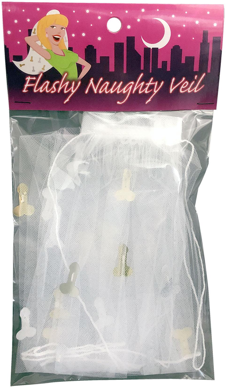 Flashing Naughty Veil from Kheper Games. NV.S36 Flashy Naughty Veil. Before she walks down the aisle, take her out in style! This is a must have for your bride to be parties with flashy gold and silver penis shaped confetti sewn into a standard veil. Includes: 1 white veil with gold and silver penis shaped confetti sewn in. Fastens with an attached bridal comb. Kheper Games – Flashing Naughty Veil. Categories: Party Games, Gifts & Supplies, Risque Party Wear, For the Bachelorette Party. 2022.