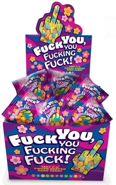 Introducing the “Fuck You, You Fucking Fuck!” Candy the sweet treat that says what everyone else is thinking! This display of 100 mini-packs, each filled with 5 sassy middle finger candies, is your new best friend for any occasion that needs a little extra attitude. Increase your impulse sales at the counter, use as party favors or as a cheeky surprise for those special people in your life who just need a friendly reminder of how you really feel. With a taste that’s as bold as its message, these candies will leave everyone laughing and craving more. Get ready to add a sprinkle of sass to your day grab your bag today and let the fun begin!