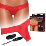 Hustler Wireless Remote Control Vibrating Panties Red M/L. Red hot passion is right at your fingertips with Hustler Toys Wireless Remote Control Vibrating Panties. These discreet panties hold a powerful vibe controlled by a remote that works from up to four feet away. Available in an attention grabbing red, these feminine panties will match your favorite pieces of lingerie and accessories. The sexy design of the thong underwear is irresistibly hot and is made offering the same quality as your favorite department store brands with its soft lace waistband, cotton crotch lining. In this set, the Classic Hustler Lingerie Thong, a consumer favorite featuring the iconic H charm, is upgraded with an erotic surprise. These discreet panties hold a powerful bullet vibe controlled by a remote that works from up to four feet away. Amp up the excitement by getting it on in thrilling new locations. The vibrating bullet features three intense speeds and seven pulsating patterns. Specifications: remote control vibrating bullet for discreet pleasure anywhere. Wireless Remote Control features ergonomic two button design. Waterproof vibrations. User friendly retrieval cord. 3 intense speeds, 7 pulsating patterns. Classic Hustler Lingerie Thong featuring sexy H charm, soft lace waistband. See through material blends into clothing. Cotton crotch lining. Hidden pocket conveniently keeps vibrating bullet in place. Ladies sizes medium to large, M/L. Materials Lace, Cotton Panties, ABS plastic bullet vibrator, remote control. Battery information: 3 AG13/LR44 batteries for bullet vibrator, included. 1 23A battery for remote controller, included.
