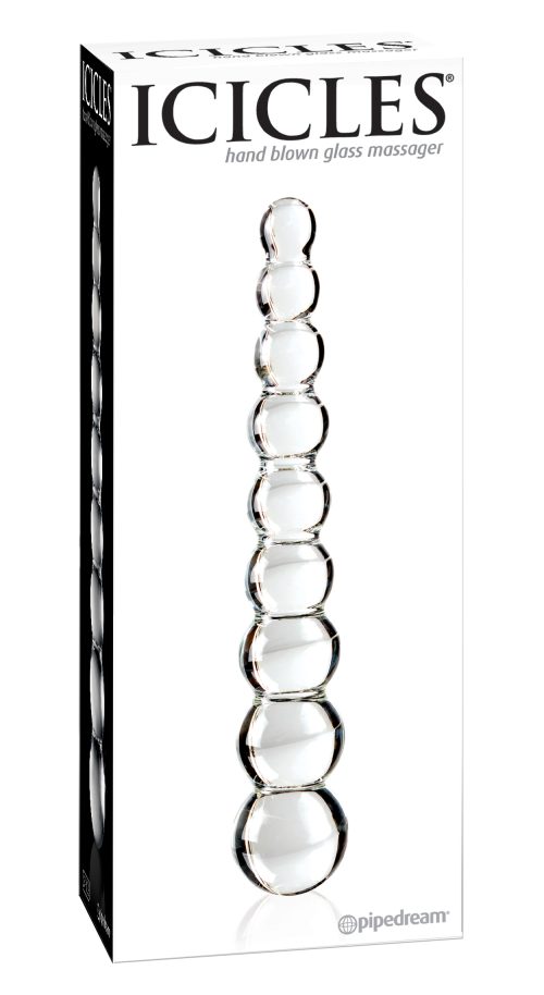 Icicles #2 Glass Anal Beads is an elegant, upscale, and hand-crafted with amazing attention to detail, this luxurious line of glass massagers will leave you breathless. Each hand-blown Icicle glass wand is sleek, unique, and made to play hard. The hypoallergenic glass is nonporous and body safe, and when cared for properly, is designed to last a lifetime. Run the wand under warm water or place it in the microwave to heat things up. Chill it under cold water or put it in the freezer for a cool sensation. Since glass is nonporous, cleanup is a snap. Use Pipedream Toy Cleaner and warm water, or throw it in the dishwasher for a worry free wash after the fun. Anal beads are made using phthalate free, non-toxic materials glass. Specifications: length 8.5 inches, width 1.5 inches, height1 inch, girth 2.5 inches, diameter 0.8 inch. Package depth 2.75 inches, width 4 inches, height 10 inches. Packaged shipping weight 12.25 ounces. Package Type Box. Country of origin China. Harmonized Tariff Schedule HTS Code 7013370000. Icicles #2 Glass Anal Beads featured in Pipedream Products Catalogs Icicles page 8, 2011 Simply the Best II page 19 and Icicles. Categories: Anal Toys, Probes, Sticks, Rods, Anal Beads. 2022.