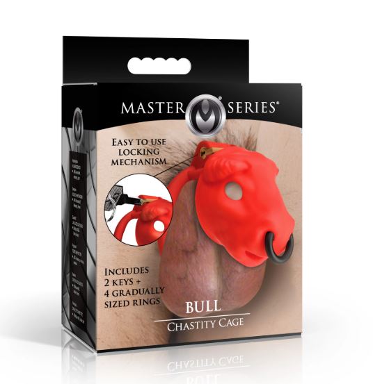 Dominate the moment, and your eager rod, with the Bull Chastity Cage. This unique chastity device features a bull head that caps the tip of the shaft, securing it in place. Enjoy a perfect fit with 4 graduated rings designed to accommodate different sizes of shaft and balls. Made from body-safe, phthalate-free plastic, this cage guarantees safe use. The bulls open mouth and eye holes act as a cum-thru tip and offer minor breathability for added comfort. Complete with a secure locking mechanism and 2 keys, you can decide when your partner deserves to be released. Master the art of restraint. Measurements:Cage is approx. 2.2 inches Length x 1.8 inches WidthRing inner diameters: 1.6 inches, 1.8 inches, 2 inches, 2.2 inchesMaterials: Plastic, brass, ironColor: Red, blackNote: Use only with water-based or silicone-based lubricants for best results.Key Features:Bull Themed Cage: Cage your raging bull by using this chastity cage! The bull head goes over the tip of the shaft, pressing it into place.Graduated Rings: There are 4 graduated rings that allow you to find the right fit for your shaft and balls.Body Safe: Play confidently with phthalate-free, body-safe plastic.Cum-Thru Tip: The bull’s mouth is open and there are holes where the eyes are providing both a cum-thru tip and mild breathability.Lock and Keys: There are 2 keys included that open the easy locking mechanism at the base. Keep your submissive or partner locked up until it’s time to let them out!