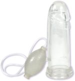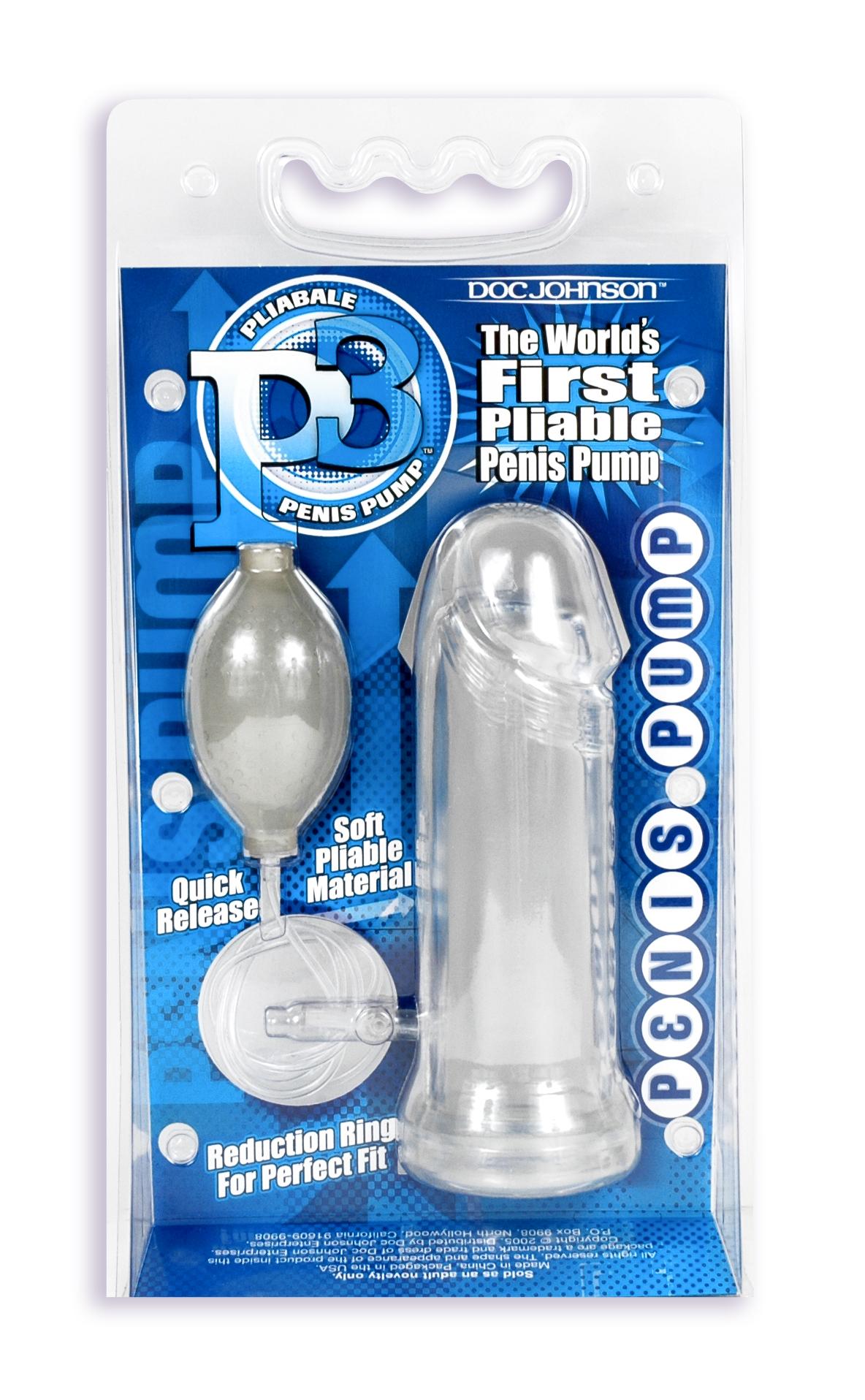 The world’s first pliable penis pump. P3 = Pliable Penis Pump. P3 Penis Pump is available in two colors: Red and Clear. Each sold separately. Put it in, pump it up, push it out, repeat as often as you like. Innovative, functional and exciting. Made of soft yet firm PVC, the P3 penis pump is at the forefront of technology. The inflation tube is inside the cylinder body. The bulb-operated vacuum can be disconnected and removed without loss of pressure utilizing Doc Johnson’s patented quick-disconnect valve. The head of the pump is shaped like a penis for realistic sex play. Also, the pump comes with a special reduction ring that will ensure a tight seal no matter the size of the penis. The P3 Penis Pump is made out of a soft pliable plastic for extra pumping comfort. P3 Pliable Penis Pump. Also, the pump comes with a special reduction ring that will ensure a tight seal no matter the size of the penis. Equipped with a size reduction ring for a perfect fit every time. A truly innovative penis pump. Made of soft yet firm PVC, the P3 penis pump is at the forefront of technology. Features: Flexible Penis Pump, Comfort Ring, Quick Disconnect Hose, Vacuum Retention, PVC, Non-Phthalate, Clear. Details: Circumference 7.54 inches. Dimensions 26.30 inches long by 2.40 inches wide by 4.30 inches deep. Material PVC. Pump Inner Diameter 32mm, 1.2598 inches. Non Phthalate Yes. Always clean before and after use. 600 Series Vaginas, Masturbators and Pumps page 64 Doc Johnson 2011 The Great American Toy Company Catalog.