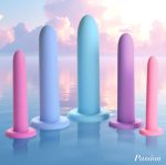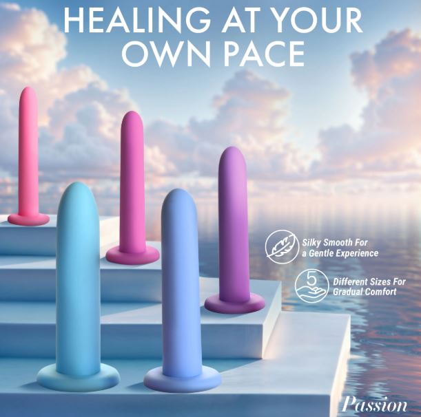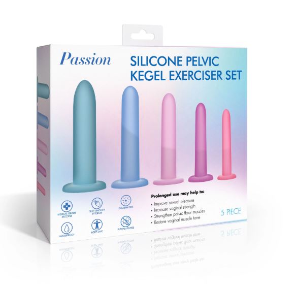 Introducing our premium-quality, body-safe silicone vulva dilator and kegal exercise set. Designed for gentle and comfortable use, each piece is made from silky smooth silicone that glides effortlessly with a touch of water-based lubricant. With five graduated sizes, this set allows you to build your confidence, strength, and control gradually, starting from the smallest size (Step 1) and progressing to the largest (Step 5). The smooth, tapered tip ensures easy insertion, and the suction-cup base lets you enjoy hands-free use on any flat surface. Perfect for those experiencing pain during penetration, these pelvic dilators can help you stretch your pelvic floor muscles and relieve tension effectively. They can be used to relax the muscles or, alternatively, you can squeeze them by doing kegels and strengthen the same pelvic muscles. Key Features:Body-Safe Silicone: This body-safe, premium-quality silicone is silky smooth and glides right in with the help of some water-based lubricant.Graduated Sizes: Work your way up from the smallest (Step 1) to the largest (Step 5) size as you gain confidence, strength, and control!Smooth and Tapered: Insertion is gentle and easy due to the tapered, smooth tip.Suction-Cup Base: Each item can be used hands-free when you place the suction-cup base on a flat surface.Pelvic Dilators: This set can help those who experience pain during penetration. Use them to gently stretch your pelvic floor muscles and release tension.Measurements:Step 1: 4.7 inches overall length, 4.4 inches insertable length, 0.7 inches widest insertable diameterStep 2: 5.2 inches overall length, 4.8 inches insertable length, 0.9 inches widest insertable diameterStep 3: 5.8 inches overall length, 5.5 inches insertable length, 1.1 inches widest insertable diameterStep 4: 6.3 inches overall length, 6 inches insertable length, 1.3 inches widest insertable diameterStep 5: 6.7 inches overall length, 6.3 inches insertable length, 1.5 inches widest insertable diameterMaterials: SiliconeColor: Pink, purple, blueNote: Use only with water-based lubricants.