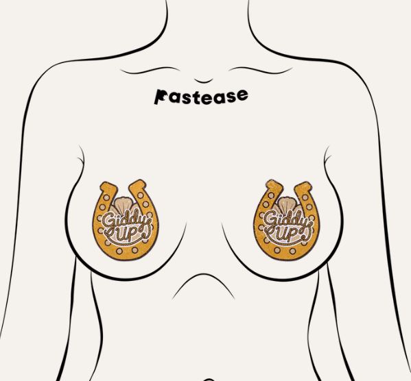 Saddle up for a wild night with these eye-catching Giddy Up Sparkling Horseshoe Golden Nipple Covers.Featuring bold rope lettering and a dazzling golden finish, these 2.5″ nipple pasties add a provocative western flair to your festival or country-themed get-up. Perfect for those wild cowgirls looking to turn heads at Night in the Country, Big Sky Festival, Watershed and more!Dimensions: 2.5 x 3″Coverage: 2.5″