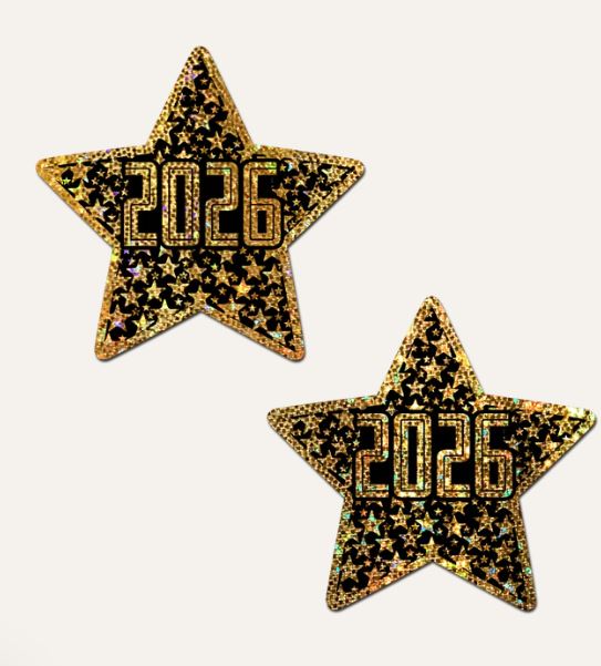 Introducing the Happy New Year Pasties 2026 Black & Gold Star Nipple Covers by Pastease Sparkle Into the New Year!Ring in 2026 with glitz, glam, and a whole lot of sparkle. These black and gold star pasties are designed to turn heads, light up the party, and keep your New Years look totally on point.Dimensions: 3″ x 3″Coverage: 1.55″Star-Studded CelebrationThese pasties arent just cutetheyre a statement. Black and gold stars shimmer with festive flair, perfect for countdowns, champagne toasts, or dancing under the disco ball.