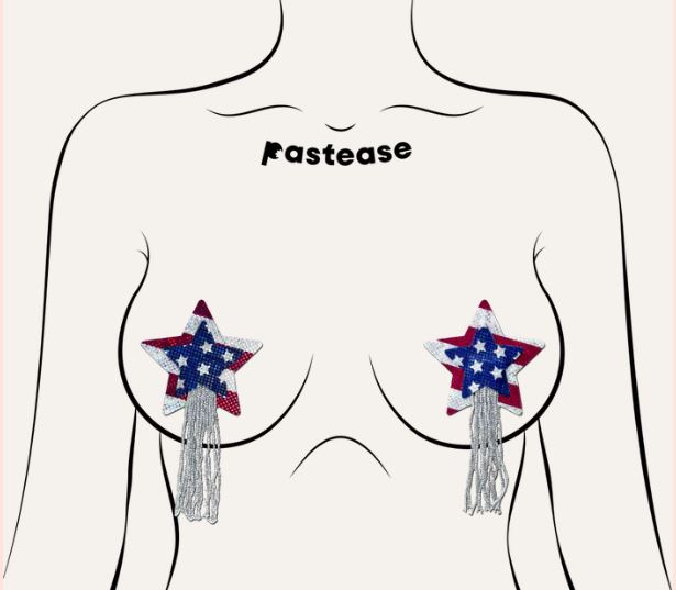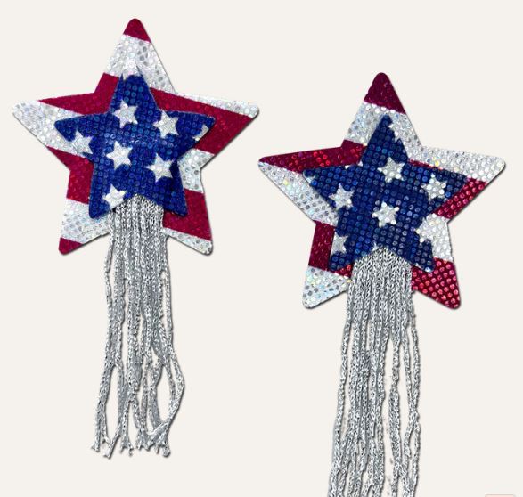 Sparkling Stars & Stripes Tassel Star Pasties by PasteaseShow your fierce freedom and let your body be the fireworks in our Sparkling Stars & Stripes Tassel Star Pasties. With glittering red, white, and blue brilliance and playful tassels that twirl with every move, these patriotic pasties are ready to turn up the heat at festivals, parades, pool partiesor anywhere you want to salute in style.- Soft yet secure with medical-grade, waterproof adhesive- Classic star shape with high-quality tassels for epic spins All-American glam made for bold reveals and body confidence- Perfect for Fourth of July, Memorial Day, or your own personal independence celebrationProudly made in the USAbecause every body deserves to sparkle.