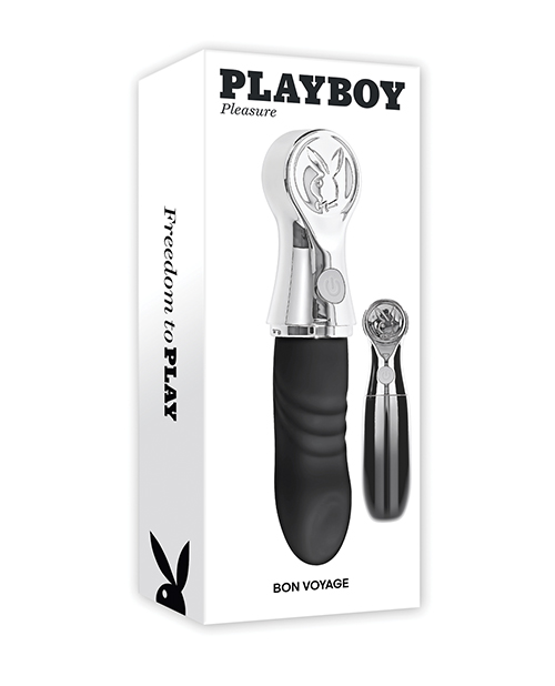 Bon Voyage! Weve got your travel adventures covered with this powerful tapping toy you can pop into any purse, bag or carry-on luggage for pleasure on the go! The chunky shaft is ribbed for extra sensation and comes to a head with 7 speeds and rhythms of tapping in the beautifully angled tip. With its ombre chrome carrier that twists into place right underneath the ergonomic Playboy rabbit head, your toy is fully protected until you pull it out for play time whenever you like. Heading to the hot tub? Bon Voyage can join your water games as its completely submersible! Specs:Play with me (key feature): Powerful tapping at head, Rabbit head travel caseTapping: 7 tapping speeds & rhythmsMaterial: Body-safe Phthalate & Latex free SiliconeWaterproof & Submersible: Yes (IPX-7)Warranty: Five yearsRechargeable: USB-C cable includedHeight: 7.37, Depth: 1.77, Width: 1.77Insertable Length: 3.75, Diameter: 1.26