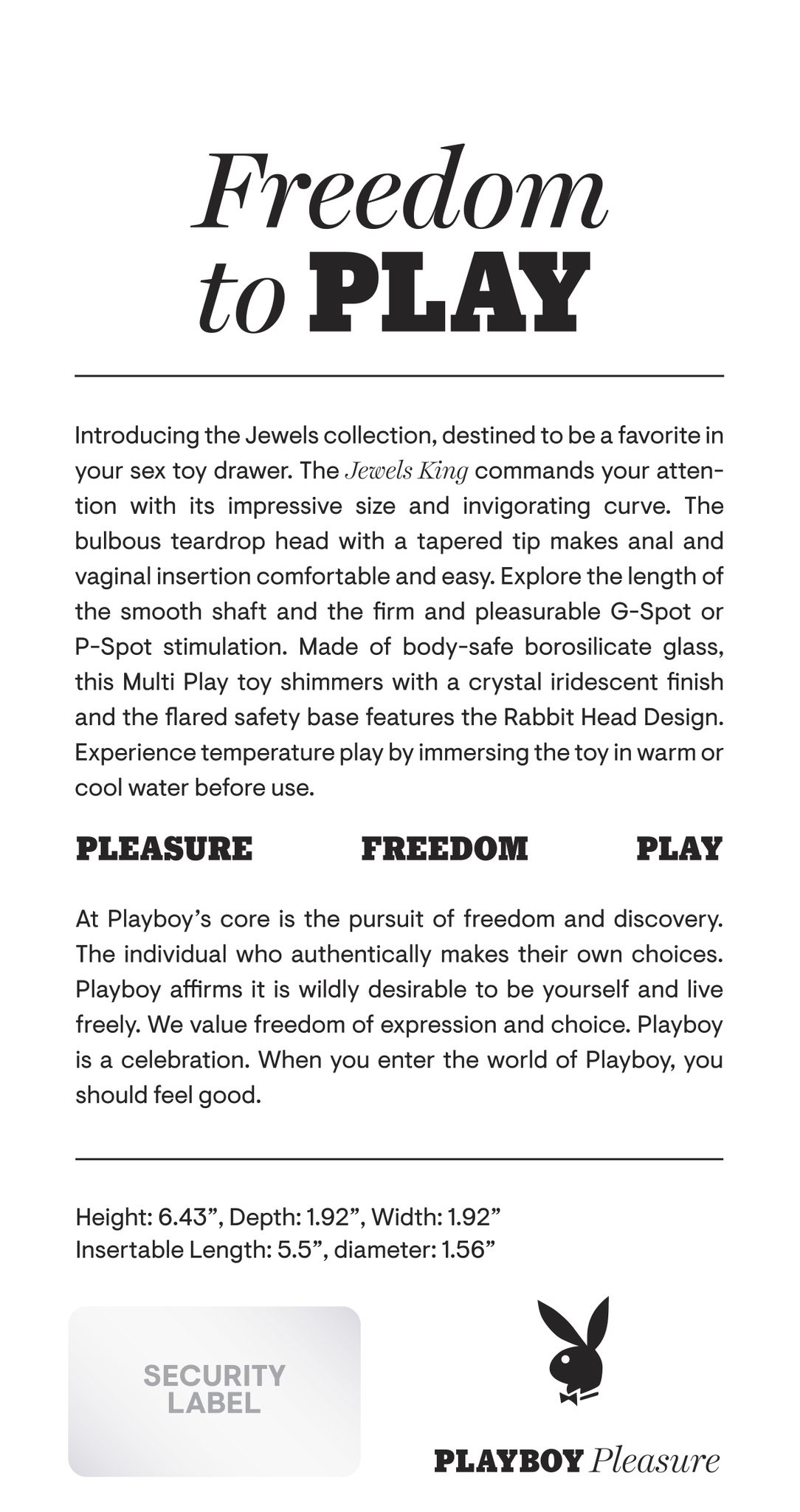 Playboy Jewels King Glass Probe from Evolved Novelties. Freedom to Play: introducing the Jewels collection, destined to be a favorite in your sex toy drawer. The Jewels King commands your attention with its impressive size and invigorating curve. The bulbous teardrop head with a tapered tip makes anal and vaginal insertion comfortable and easy. Explore the length of the smooth shaft and the firm and pleasurable G-Spot or P-Spot stimulation. Made of body safe Borosilicate Glass, this Multi Play toy shimmers with a crystal iridescent finish and the flared safety base features the Rabbit Head Design. Experience temperature play by immersing the toy in warm or cool water before use. Panel details: Play with me key features: shatter resistant Glass, deeply curved Multi Play Toy. No vibration. Material: Borosilicate Glass. Waterproof and submersible. 5 years Warranty. Size specifications: height 6.43 inches, depth 1.92 inches, width 1.92 inches. Insertable length 5.5 inches, diameter 1.56 inches. Categories: Anal Toys, Prostate Massagers, P-Spot Stimulators, Probes, Sticks, Rods, Dildos, Dongs, G-Spot. 2024.