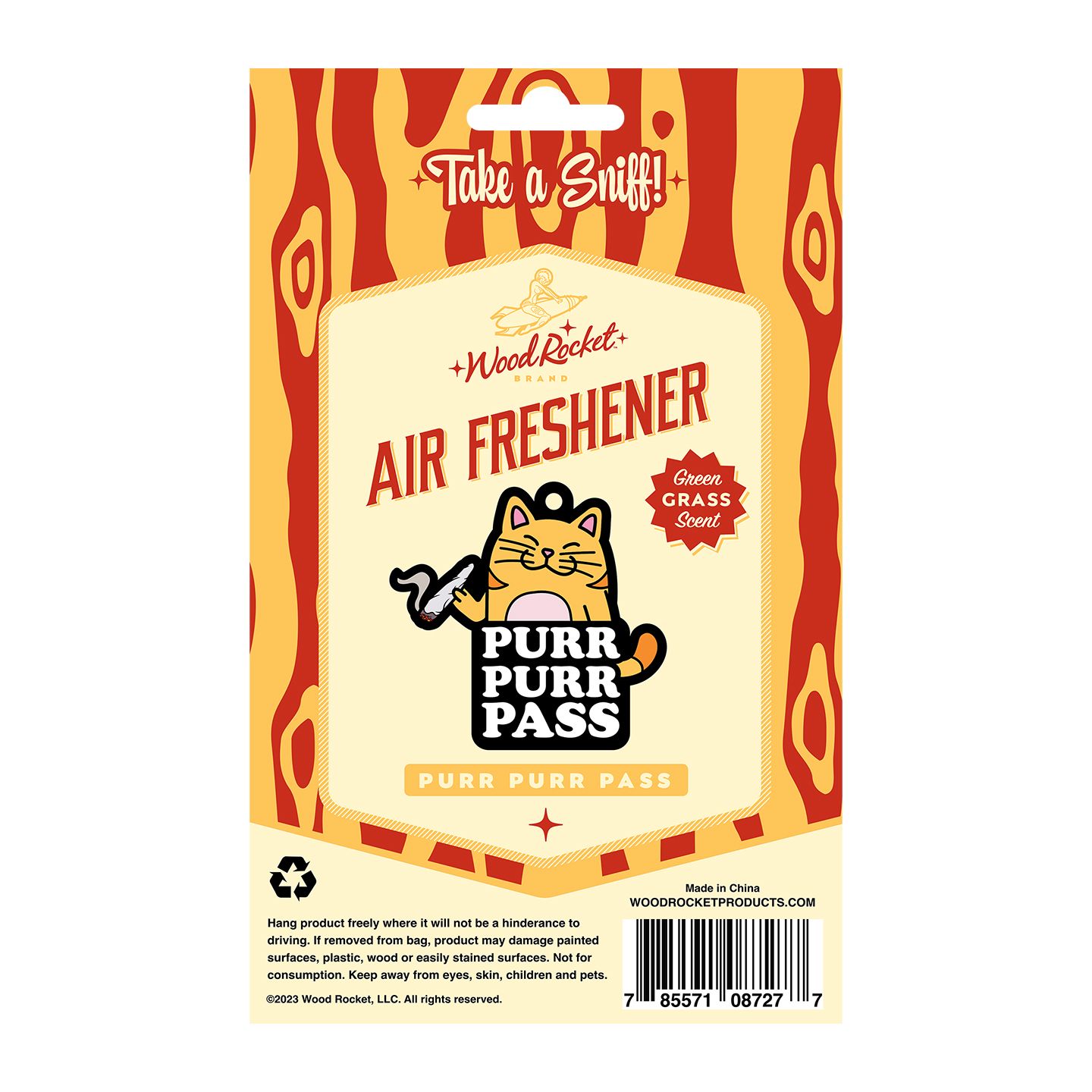 Purr Purr Pass Air Freshener from Wood Rocket. Meow never looked so good! Green grass scent. Hang product freely where it will not hinder driving. Each air freshener comes with a string to hang it from car rear view mirror. If removed from the bag, products may damage painted surfaces, plastic, wood or easily stained surfaces. Not for consumption. Keep away from eyes, skin, children and pets. Categories: Party Games, Gifts, Supplies, Adult Gags, Gifts and Novelties. 2023.