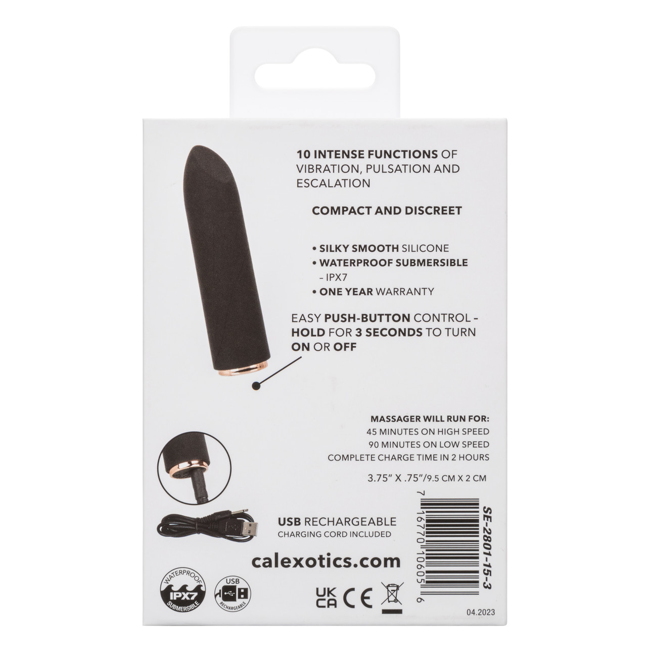 Raven Teaser Black Vibrator from California Exotic Novelties. Experience discreet pleasure with the Raven Teaser, a compact mini massager designed for your ultimate satisfaction. Its smooth and pinpointed tip provides precise stimulation wherever you desire. With 10 intense functions of vibration, pulsation, and escalation, you can customize your experience to match your desires. Explore the range of sensations and find the perfect setting for your pleasure. Crafted from body safe Silicone, this mini massager ensures a velvety smooth touch while being completely waterproof and submersible up to IPX7 standards. Take it with you into the bath or shower and indulge in sensual water play. Thanks to the state of the art memory chip, the massager resumes on the last function used, allowing you to pick up right where you left off. The security travel lock feature ensures discreet transportation, and the USB rechargeable design with included charging cord makes it convenient and eco-friendly. A full charge takes only 2 hours, providing up to 45 minutes of play time on high speed and an impressive 90 minutes on low speed. Discover discreet pleasure on your terms with the Raven Teaser, designed to deliver exquisite sensations with its smooth and pinpointed tip. Specifications: SKU SE-2801-15-3. Color: Black. 1 year warranty. Features: Phthalate free, Rechargeable, Vibrates. Waterproof rating of IPX7. Power source: USB Rechargeable cord included. Material type: Silicone Massager, Button, ABS Plastic with Metallic Plating decor. Measurements: 3.75 inches by .75 inch. Bulk weight 1.5 ounces. Package 4.8 ounces. Package: 1.25 inches by 3.5 inches by 6 inches. Maximum run time90 minutes. Maximum charging time 120 minutes. Functions 10. Categories: Vibrators, Bullets, Eggs, Eco-Friendly Sex Toys, Rechargeable Vibrators, Sex Toys for Women, Vibrating Bullets and Eggs. 2023.