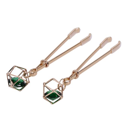 A touch of tease, a hint of pressure, and a whole lot of glam. The Indica Nipple Clips feature adjustable tension and soft rubber tips for comfort and control. A dangling green gem and gold hardware add a luxurious flair, making these perfect for visual and physical stimulation. Whether you’re dressing up for a scene or exploring sensation play for the first time, these clips deliver pleasure with style.Features:Adjustable tension for personalized pressureSoft rubber tips for comfort and gripGreen jewel and gold hardware for a luxe, eye-catching look