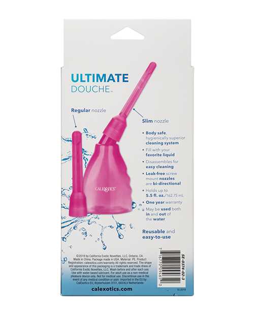 Ultimate Douche Purple from California Exotic Novelties. Water System Collection.The Cal Exotics Ultimate Douche is exactly as described. The ultimate anal douche apparatus. With the douche in hand, you can be confident that you are maintaining the highest standard of anal hygiene, any concerns about cleanliness can be left at the door with our premium Anal Douche.This fully re-usable anal douche system is easy to dismantle, meaning that you can clean it quickly and easily, and the sturdy construction means that your unit is built to last. It features a completely transparent bottle, allowing the user to gauge exactly how much water is in the douche. Not only is it hygienic, but it is also incredibly safe to use, so you have full peace of mind when using our product.This superior cleaning system comes complete with two attachments, allowing you a number of options when it comes to douching. Opt for the more discreet, easy to use, smaller attachment when time is of the essence, or use the larger attachment when using your Ultimate Douche as part of your water play experience. Reusable, easy to use, easy to clean transparent plastic bottle includes two interchangeable nozzles. Perfect for women or men! Safe and pure for body and pleasure. Made using phthalate free, non-toxic materials Polyethylene PE. Slim nozzle 3.25 inches long by .25 inch wide. Standard nozzle measures 3.5 inches long by .5 inch. Bulk weight 1.3 ounces. Always clean before and after use. Ultimate Douche is a registered trademark for California Exotic Novelties. Categories Ultimate Anal Douche: Anal Toys, Health and Beauty Aids, Anal Douches, Enemas, Hygiene, Hygiene and Intimate Care. 2023.