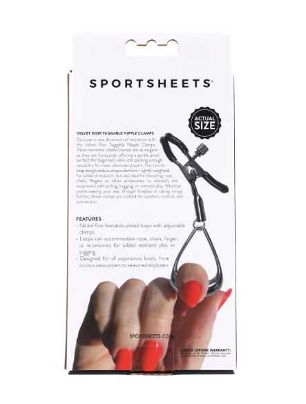 Discover a new dimension of sensation with the Velvet Noir Tuggable Nipple Clamps. These hematite-plated clamps are as elegant as they are functional, offering a gentle pinch perfect for beginners while still packing enough versatility for more advanced players. The circular loop design adds a unique elementlightly weighted for subtle stimulation, but also ideal for threading rope, chain, fingers or other accessories to intensify the experience with pulling, tugging, or restraint play. Whether you’re teasing your way through foreplay or taking things further, these clamps are crafted for comfort, control, and connection.Features:Nickel free hematite with adjustable clampsLoops can accommodate rope, chain, finger, or accessories for added restraint play and tuggingDesigned for all experience levels, from curious newcomers to seasoned explorersMaterials: 50% Zinc Alloy, 40% Iron Alloy,10% Silicone