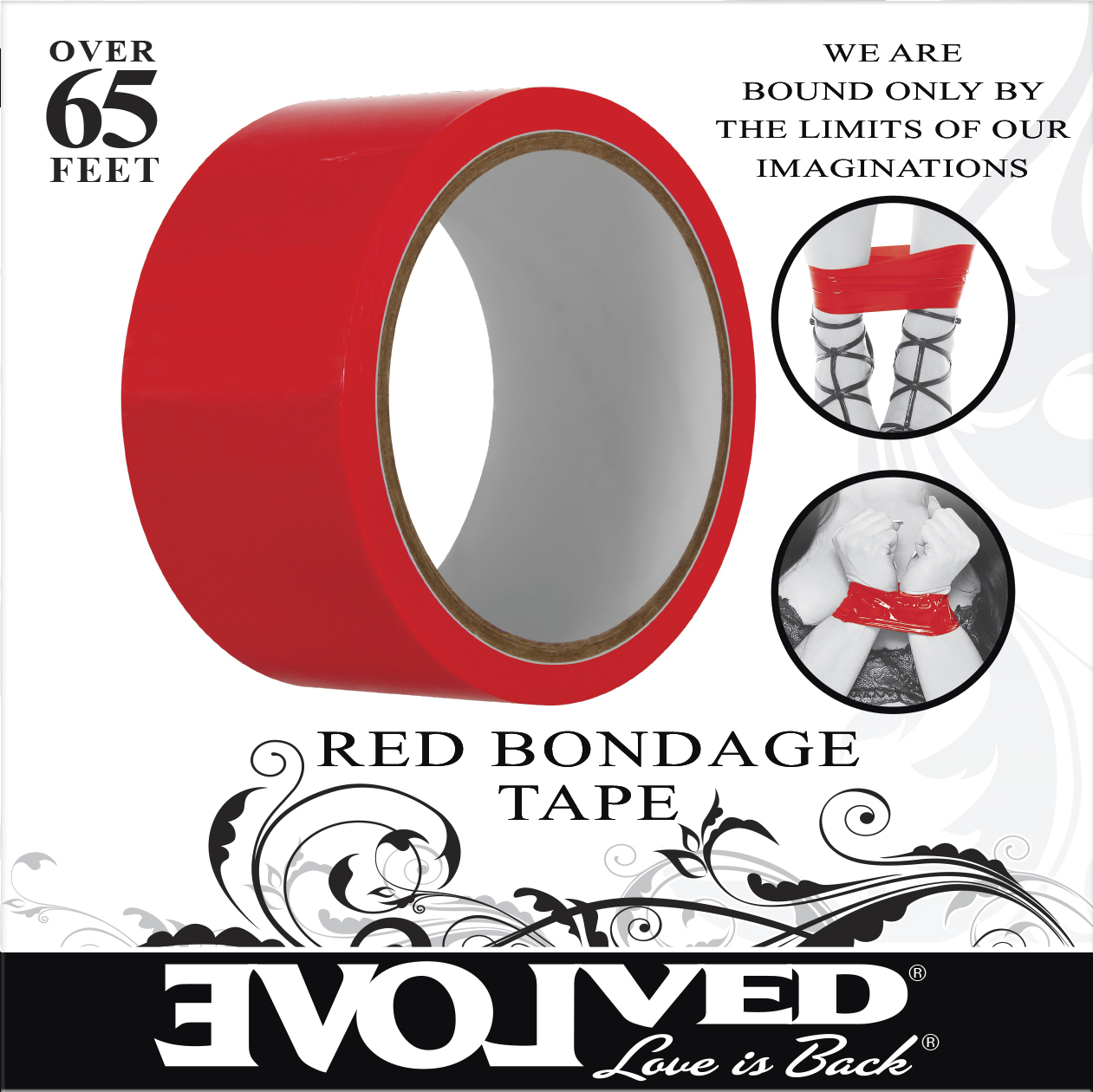 (WD) Evolved Bondage Tape Red 65 feet. We are bound only by the limits of our imagination. Over 65 feet of tape. Tie your lover up with red hot glossy tape that feels incredible erotic as it wraps around tight. Strap hands together or to a bed post wind it around your partner’s body in all the right places even use it as a blindfold. Your imagination is the limit with its visually striking tape that has no sticky reside that has no sticky adhesive or pull your hair. It only holds tight itself creating a truly fun and hassle free experience. Self adhesive bondage tape experience. Features made from PVC Vinyl. Shiny smooth look and feel. Red hot striking color. Perfect for tying up your lover. Can be used as a gag or blindfold. Will not leave residue or pull hair. Just about 2 inches in width. Approximately 2 inches in width by 65 feet in length. Evolved Novelties love is back. Categories: Bondage, Fetish, Kink, Naughty Role Play, Sex Toys for Couples, Bondage Restraints. No longer available. 2023.
