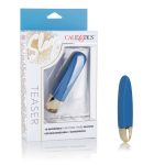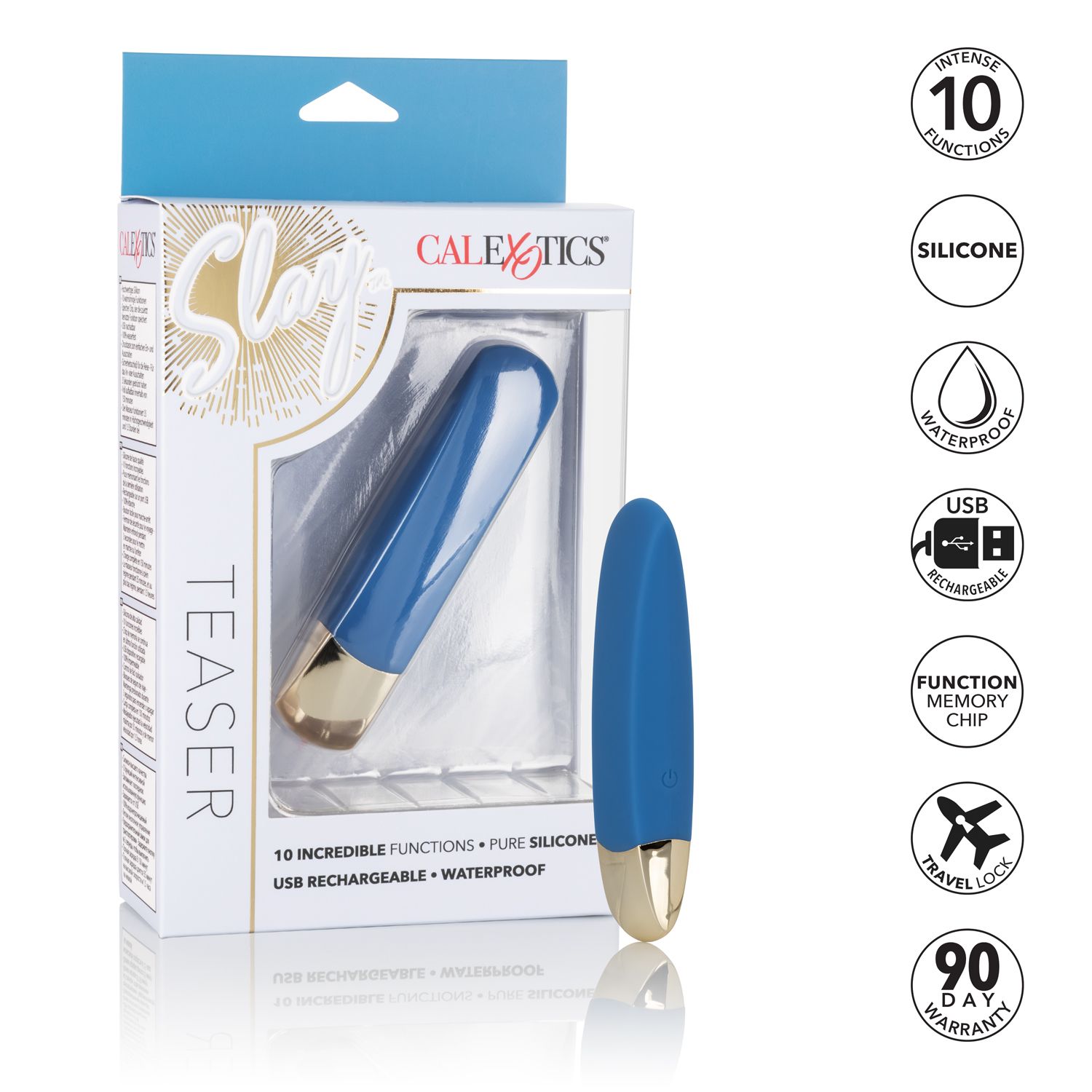 (WD) Slay Teaser Blue Bullet Vibrator from California Exotic Novelties. From the office to the bedroom, you were made to slay. Slip the tickling Slay Teaser into your purse or handbag for knee shaking pleasure wherever you go. The petite massager fits between your fingers to let you deliver pinpoint tantalization and thrill with flickering vibrations. Get playful while you flicker through 10 indulgent vibration, pulsation and escalation functions with the easy touch control button. Effortlessly control pure pleasure with an easy touch silicone button and hold for 3 seconds to turn on or off. The ultra plush silicone and uniquely flexible body are great for exploring sensual sweet spots and intimate pleasure points with ease. The smooth shape and supple surface deliver thrilling vibrations from any angle your desire. Use the smooth single button control to enjoy up to 1.5 hours of vibrating pleasure. Charge up your passion in only 2.5 hours by plugging the provided USB cable into the self sealing charging port on the back of the massager. The slim massagers discreet 4 inches size makes it the perfect travel companion, letting you embrace radiating pleasure wherever your fantasies take you. Color Blue. MaterialsSilicone, ABS Plastic with Metallic Plating. Power source USB Rechargeable, included. FeaturesPhthalate free, waterproof, rechargeable, vibrates. 1 year warranty. Maximum run time 90 minutes. Maximum charging time 210 minutes. Measurements 4.5 inches by 1 inch overall. 2.5 inches by 1 inch vibrator. Bulk weight 1.6 ounces. Package 4.7 ounces, 2 inches by 4.75 inches by 8.5 inches. No longer available. 2023.
