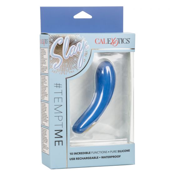 (WD) Slay #TemptMe Blue Vibrator from California Exotic Novelties. Slip the teasing Slay #TemptMe into your purse or handbag for knee shaking pleasure wherever you go. The sensually curved bullet massager fits between your fingers to let you deliver pinpoint tantalization while thrilling ridged tickle and tease. Get playful while you flicker through 10 indulgent vibration, pulsation and escalation functions with the easy touch control button. Effortlessly control pure pleasure with an easy touch silicone button and hold for 3 seconds to turn on or off. The ultra plush silicone and ribbed body are great for exploring sensual sweet spots and intimate pleasure points with ease. With a rounded tip and curved body, you will be able to indulge in thrilling vibrations from any angle your desire. Use the smooth single button control to enjoy up to 2 hours of vibrating pleasure. Charge up your passion in only 2 hours by plugging the provided USB cable into the self-sealing charging port on the back of the massager. The slim massager discreet 4 inches size makes it the perfect travel companion, letting you embrace radiating pleasure wherever your fantasies take you. Specifications ColorBlue. Materials Silicone, ABS Plastic with Metallic Plating. Power source USB Rechargeable included. Features Phthalate Free, Waterproof, Rechargeable, Vibrates. 1 year warranty. Maximum run time 120 minutes. Maximum charging time120 minutes. Measurements2.25 inches by 1.25 inches massager. 4.25 inches by 1.25 inches overall. Bulk weight 1.8 ounces. Package 4.8 ounces. Package 8.5 inches by 4.75 inches by 2 inches. Categories: Vibrators, Rechargeable Vibrators, G-Spot, Sex Toys for Women. No longer available. 2023.
