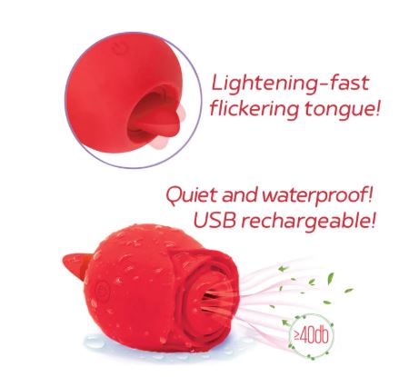 The classic suction rose but with a bonus; a wildly quivering tongue on the opposite end. Tongue and suction both have six speeds, and recharge fast and easy with magnetic UBS ports. 100% medical-grade silicone and fully waterproof to IPX6 specs! In Icons own lipstick red, the brightest red in silicone! Strong suction on one end Flickering tongue on the other! 6 speeds suction and flicker Icons own lipstick red Perfectly hygienic silicone