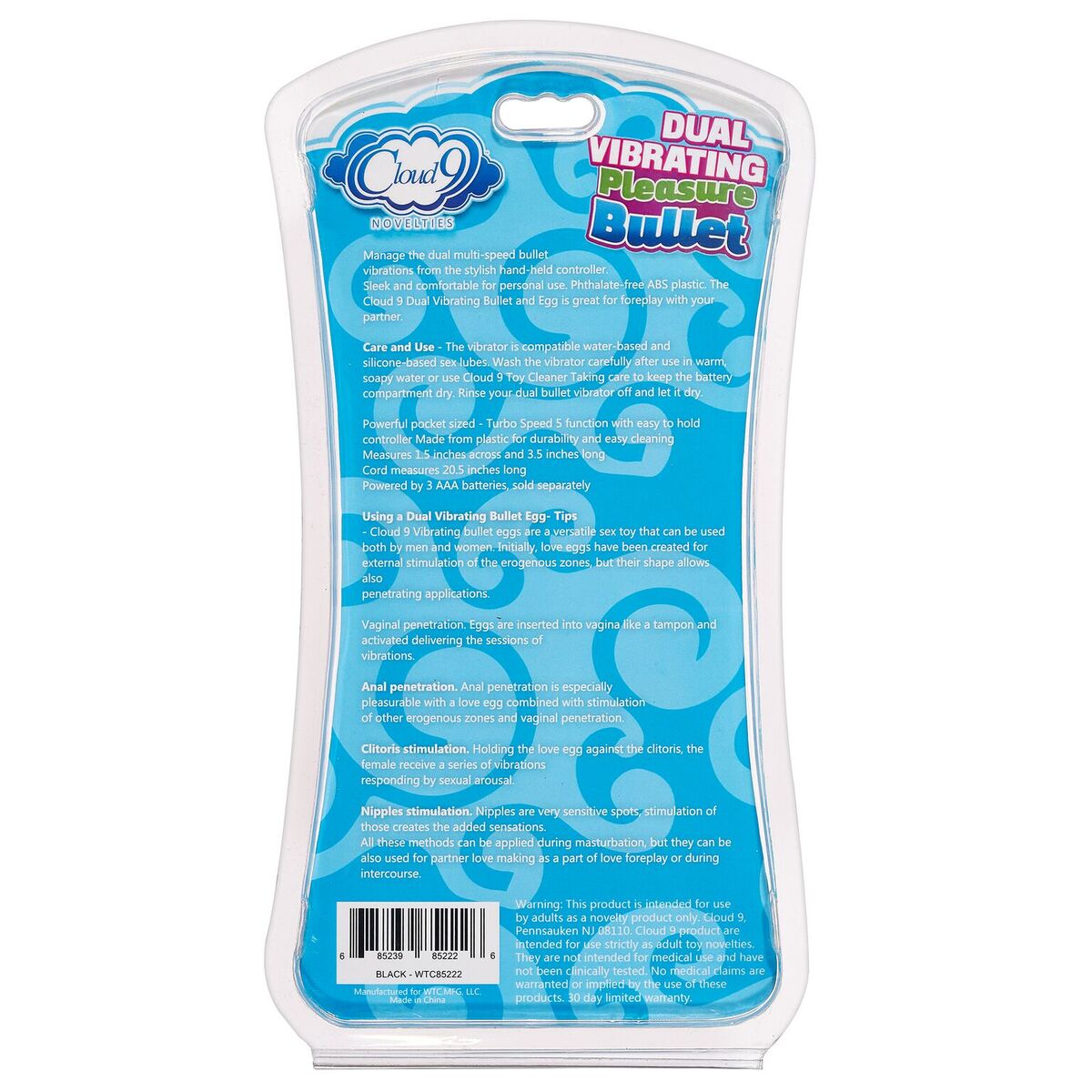 The Cloud 9 Novelties Bullet features 5 vibrating functions with attached wired remote and clitoral stimulator. This dual vibrating Bullet is great for foreplay with your partner! Manage the multi-speed bullet vibrations from the stylish hand held controller. Velvety in texture and comfortable for personal use, this product is made of body safe, phthalate free ABS plastic with polyurethane PU coating. Care and use the Cloud 9 Vibrating Pleasure Bullet is compatible with both water based and silicone based lubes. Wash the vibrator after each use in warm, soapy water or use Cloud 9 Toy Cleaner. Splash-proof only. Features: 5 vibrating functions. Easy to hold soft PU coated controller. Pleasure bullets great for couples or solo use. Attached power control wire length 24 inches. Light Emitting Diode LED indicator light. Specifications: 3 speed and 12 functions with easy to hold controller. Ergonomically designed remote control. Bullet attachment measures 2.16 inches across and 1.0 inch long. Cord measures 24 inches long. Vibrating egg requires 3 AAA batteries, not included. Sold separately. Categories: Vibrators, Sex Toys for Women, Vibrating Bullets and Eggs, Dual Bullets and Eggs. Manufactured for Cloud 9 Novelties. Made in China. Weight 3.7 ounces. Restricted, Amazon, Restricted. 2022.
