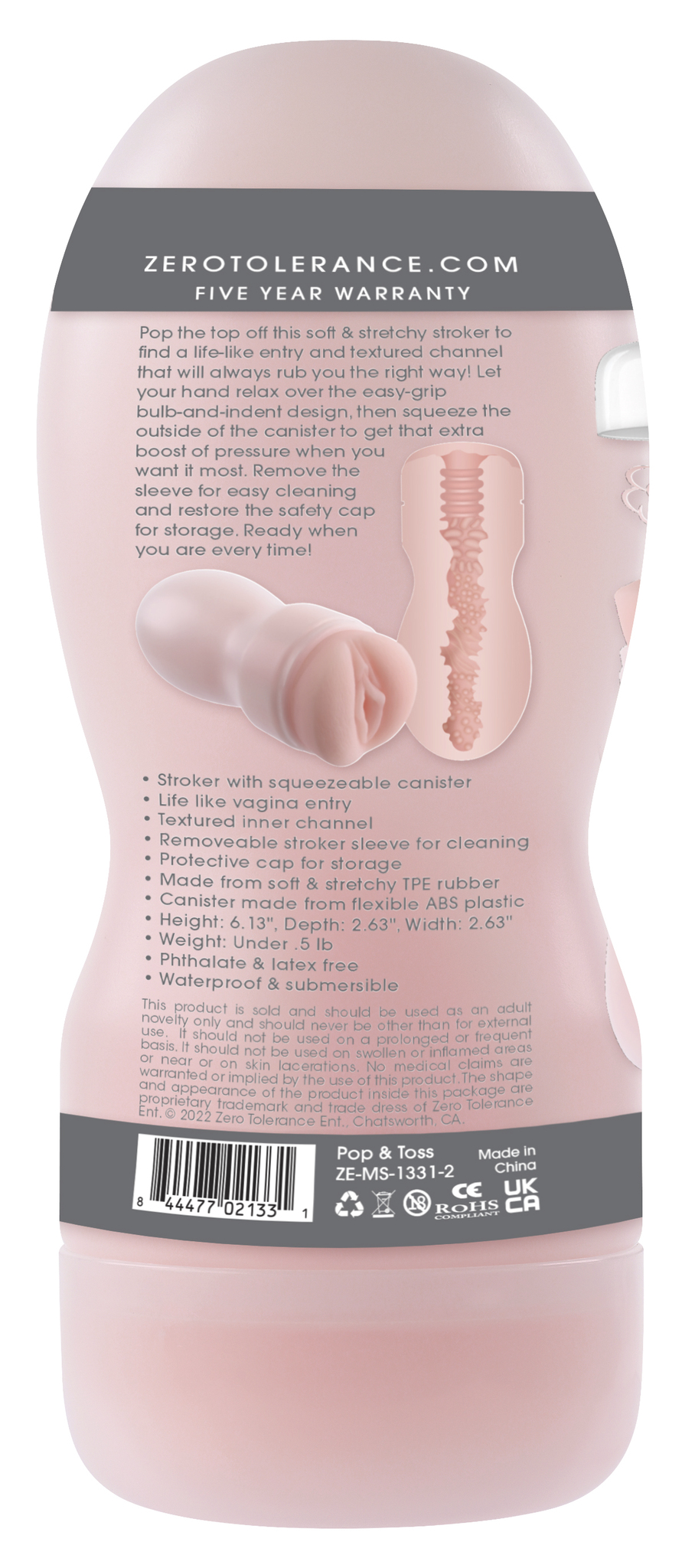 Zero Tolerance Pop and Toss from Evolved Novelties. Pop the top off this soft and stretchy stroker to find a life like entry and textured channel that will always rub you the right way! Let your hand relax over the easy grip bulb and indent design, then squeeze the outside of the canister to get that extra boost of pressure when you want it most. Remove the sleeve for easy cleaning and restore the safety cap for storage. Ready when you are every time! Features: stroker with squeezable canister. Life like vagina entry. Textured inner channel. Removeable stroker sleeve for cleaning. Protective cap for storage. Made from soft and stretchy Thermoplastic Elastomers TPE rubber. Canister made from flexible ABS Plastic. Size height 6.13 inches, depth 2.63 inches, width 2.63 inches. Bulk weight under half a pound .5lb. Phthalate free and latex free. Waterproof, submersible, non-vibrating stroker sleeve. Categories: Male Masturbators, Health and Beauty Aids, Solo Masturbators, Pussy Shaped Stroker. 5 years warranty. 2023.