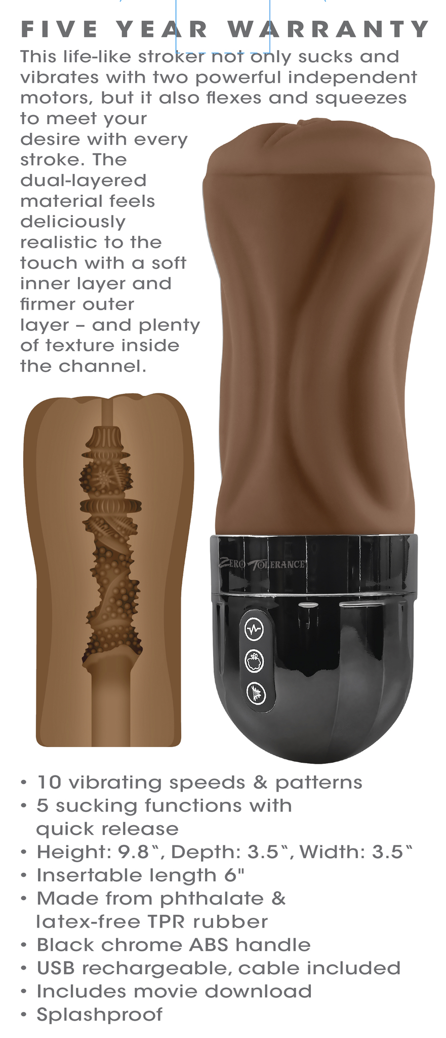 Zero Tolerance Tight Lipped Dark Stroker, Movie Combo from Evolved Novelties. This life like Stroker not only sucks and vibrates with two powerful independent motors, but it also flexes and squeezes to meet your desire with every stroke. The dual layered material feels deliciously Realistic to the touch with a soft inner layer and firmer outer layer and plenty of texture inside the channel. Tight Lipped Dark features: 10 vibrating speeds and patterns. 5 sucking functions with quick release. Size height 9.8 inches, depth 3.5 inches, width 3.5. Insertable length 6 inches. Made from body safe materials that are both phthalate free and latex free Thermoplastic Rubber TPR Rubber Stroker. Black Chrome ABS Plastic Handle base. USB rechargeable, cable included.Includes movie download. Splashproof for easy cleaning and shower play. Splash not submersible. Categories for Tight Lipped Stroker: 5 years warranty. Care instructions: clean product with an adult toy cleaner or soap and warm water before and after each use. Store this product in a clean, dry space preferably in a bag or box. Not touching other sex toys. Please note that oil based personal lubricants can corrode toys materials. Please recycle contains Lithium.Li-Ion must be recycled. Lithium-ion battery. Categories: Male Masturbators, Vibrators, Sex Toys for Men, Rechargeable Vibrators, Realistic Strokers, Solo Masturbators, Pussy. 2023 Catalog.